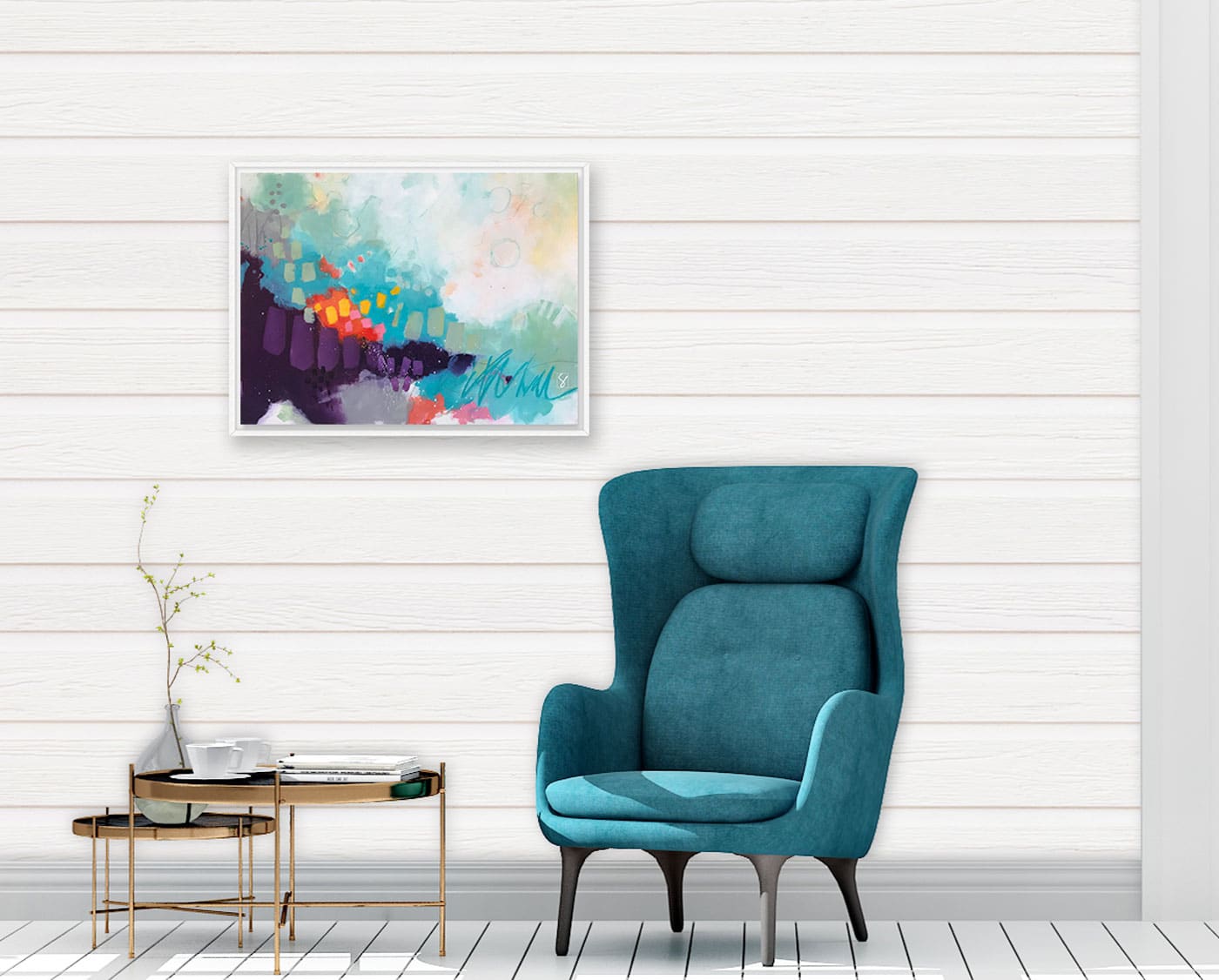 This original acrylic painting. a contemporary modern abstract featuring teal, sage green and a deep purple with bold hints of garden color.