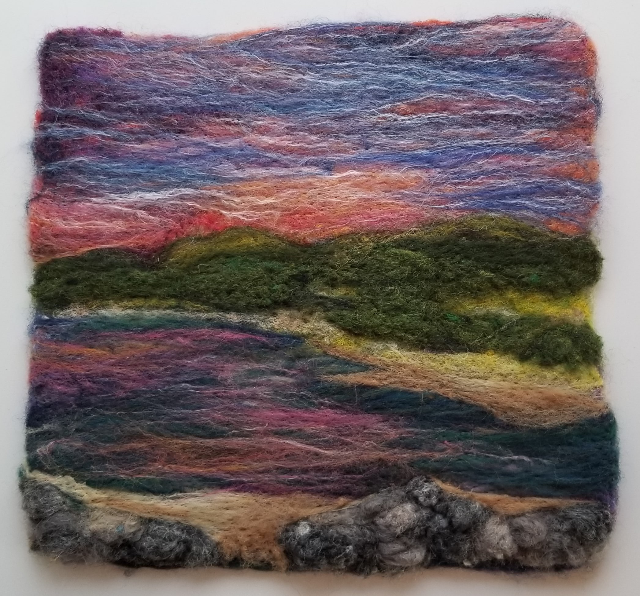 Original art, hand felted with 100% wool fleece. Needle felted, with merino and silk fibers. 10.5 by 10.5 “. This piece is not mounted, it is on a solid backing.: I can have it ready to hang before shipping, or you can have it framed.