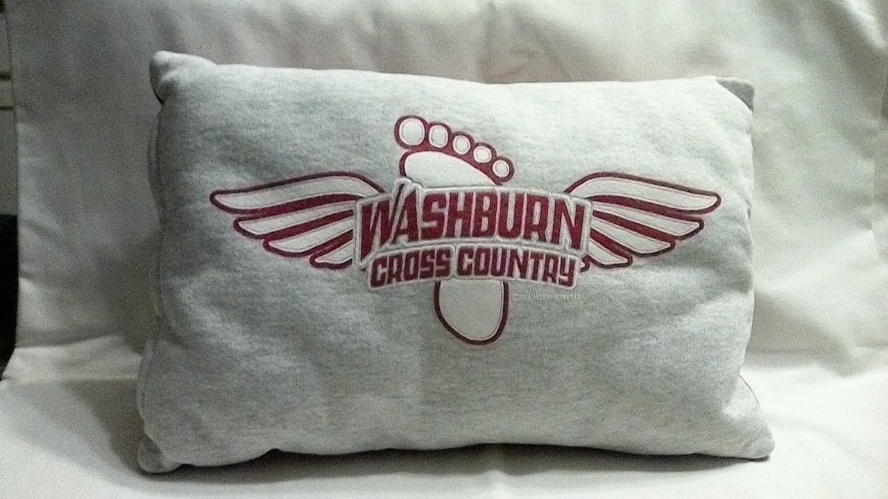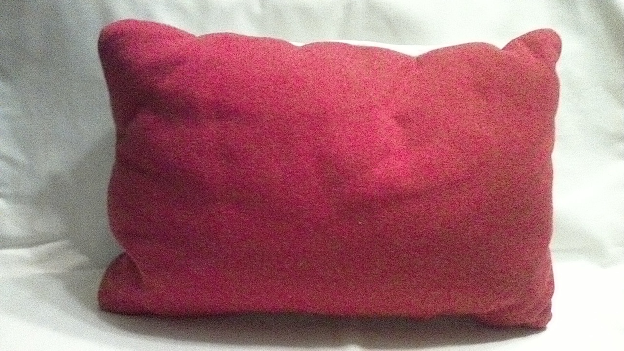Red cotton knit front has white lettering. Solid grey fleece back. Zipper and inner pillow.