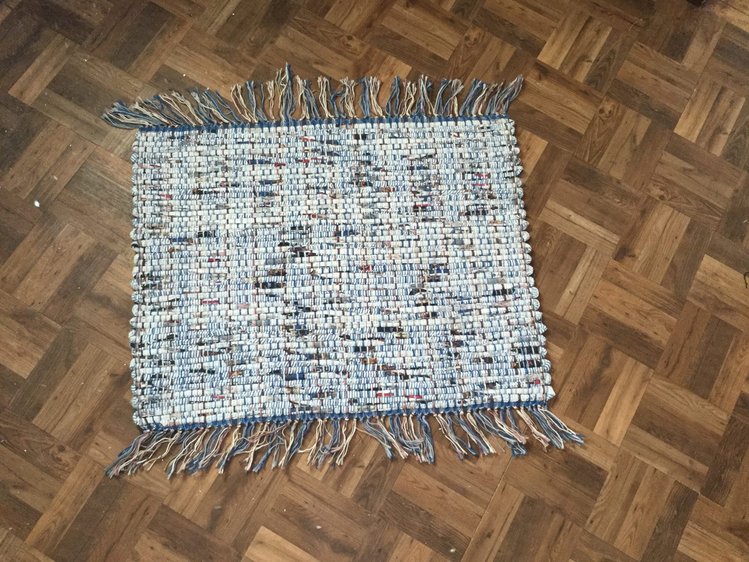 White and Blue Handwoven Cotton/poly Rug 32″ x 28″