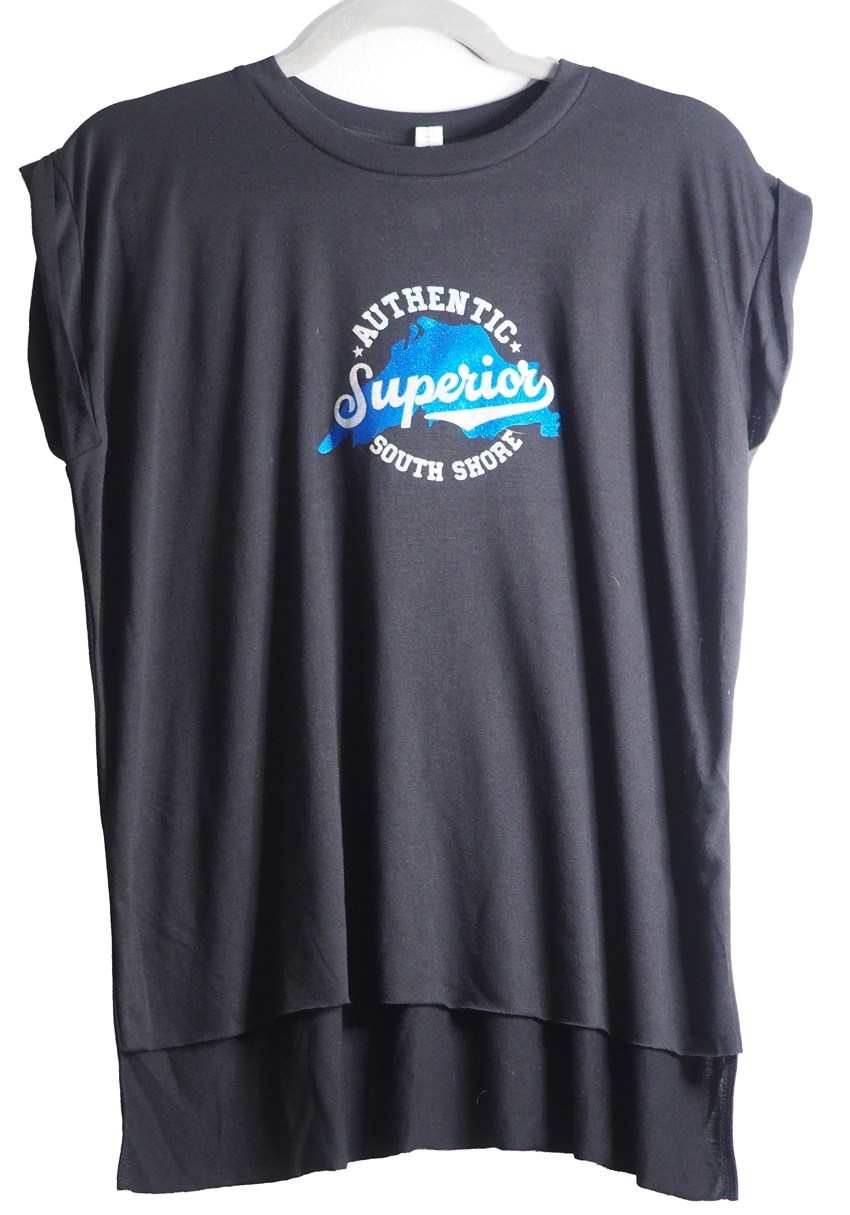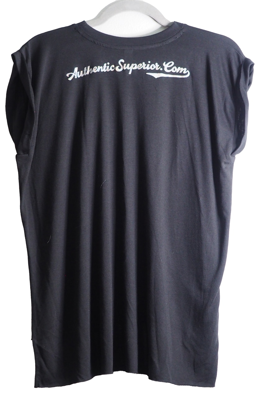 Perfectly flowy muscle tee features the Authentic Superior logo in silver & blue glitter on the front and the web site’s URL in silver glitter script on the back.