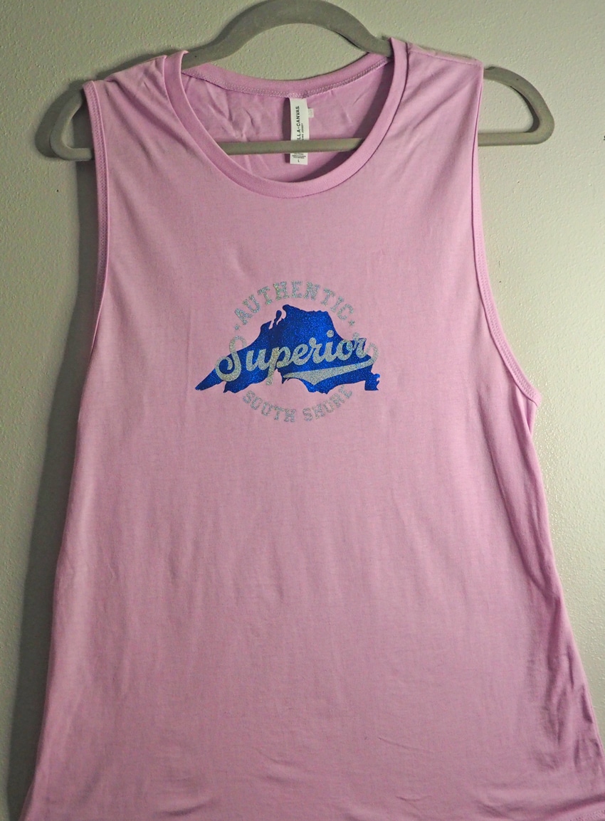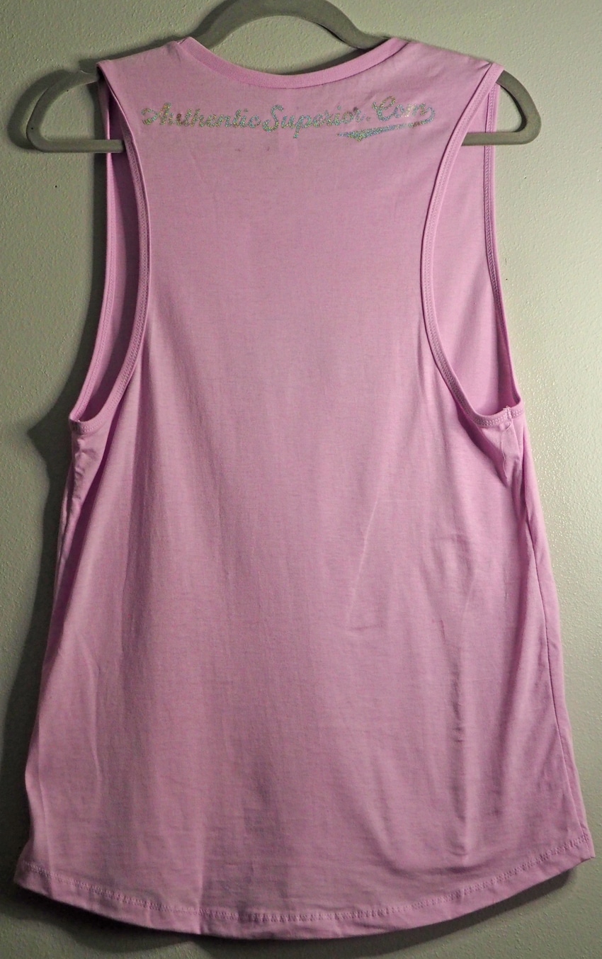 Super-comfy muscle tank is perfect for layering and features the Authentic Superior logo in silver & blue glitter on the front and the web site’s URL in silver glitter script on the back.