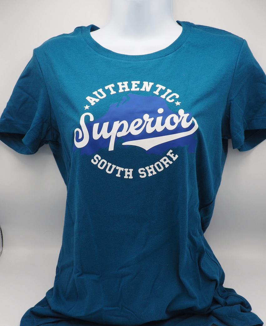 Traditional t-shirt featuring a slim feminine fit, crew neck, short sleeves. Features the Authentic Superior logo in silver & blue glitter on the front and the web site’s URL in silver glitter script on the back. Note: Does run small, order 1-2 sizes up from normal size for a less slim fit.