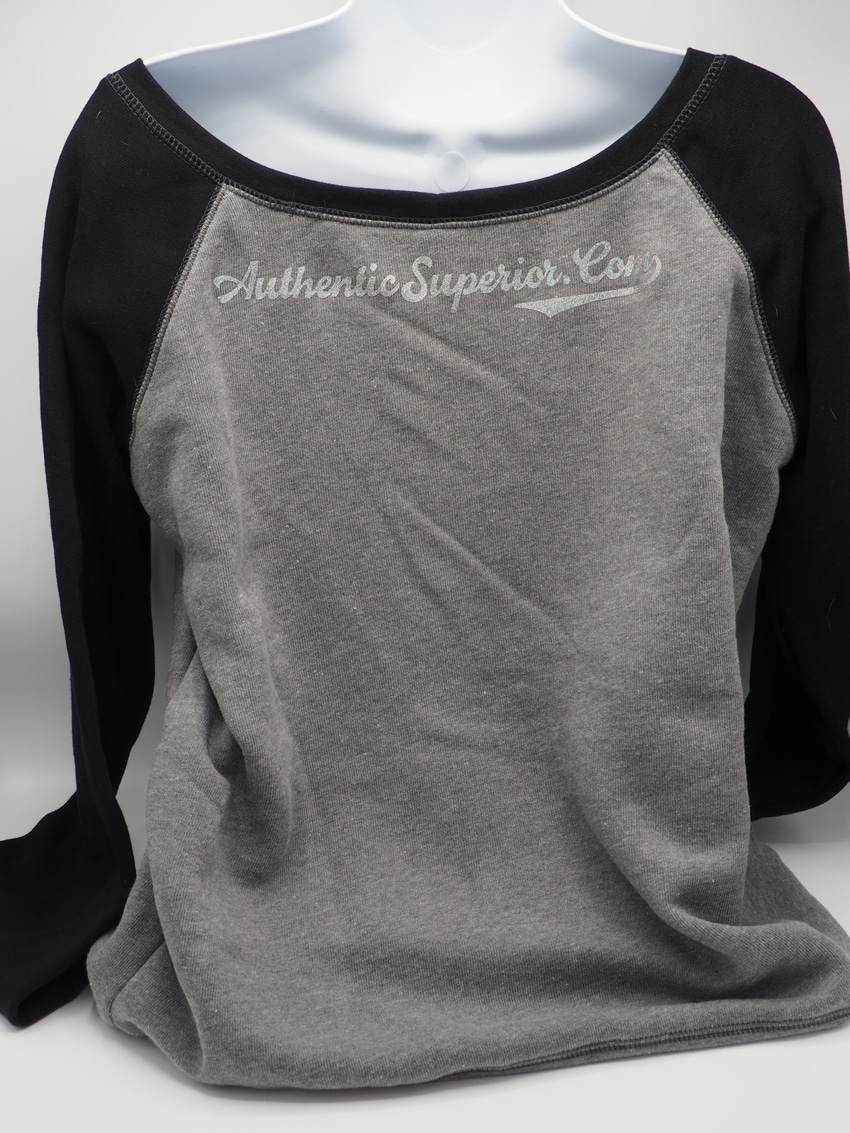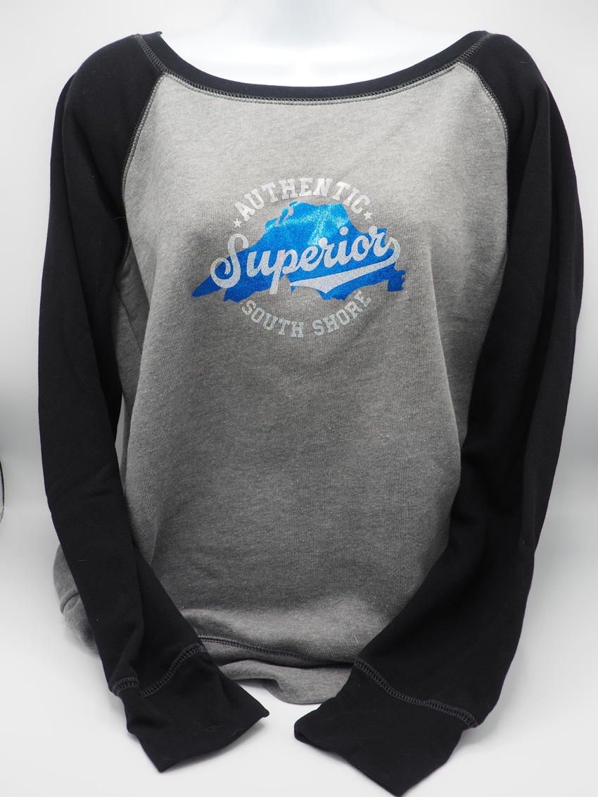 Cozy and versatile, this women’s wide neck sweatshirt is designed with an exceptionally plush fabrication, in a classic pullover fit that can be worn pulled off the shoulder and long sleeves. Features the Authentic Superior logo in silver & blue glitter on the front and the web site’s URL in silver glitter script on the back. Note: Does run small, order at least one size up from normal size for a less slim fit.